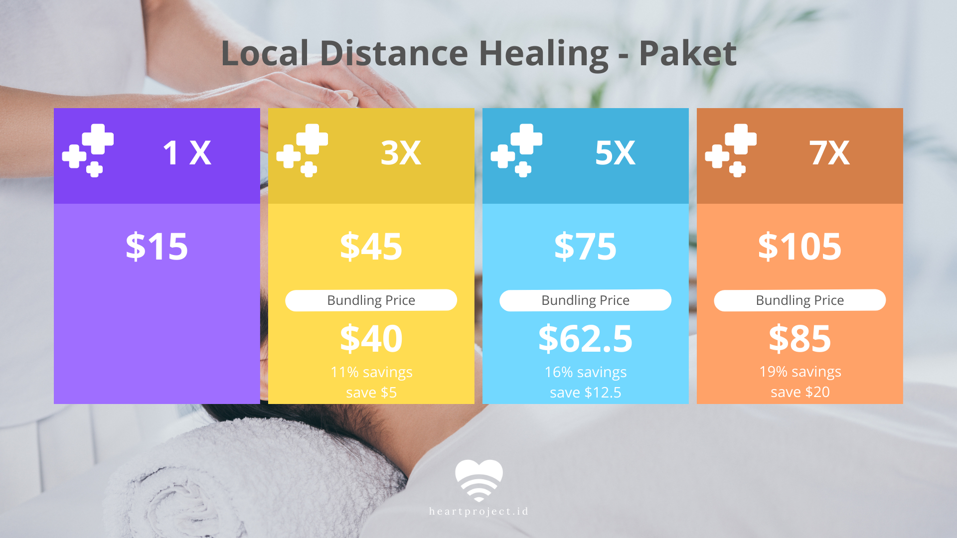 The price for Local - Distance Healing is USD.15/ 30 minutes if you are from outside of Indonesia or IDR. 200.000/ 30 minutes if you are Indonesian Resident.