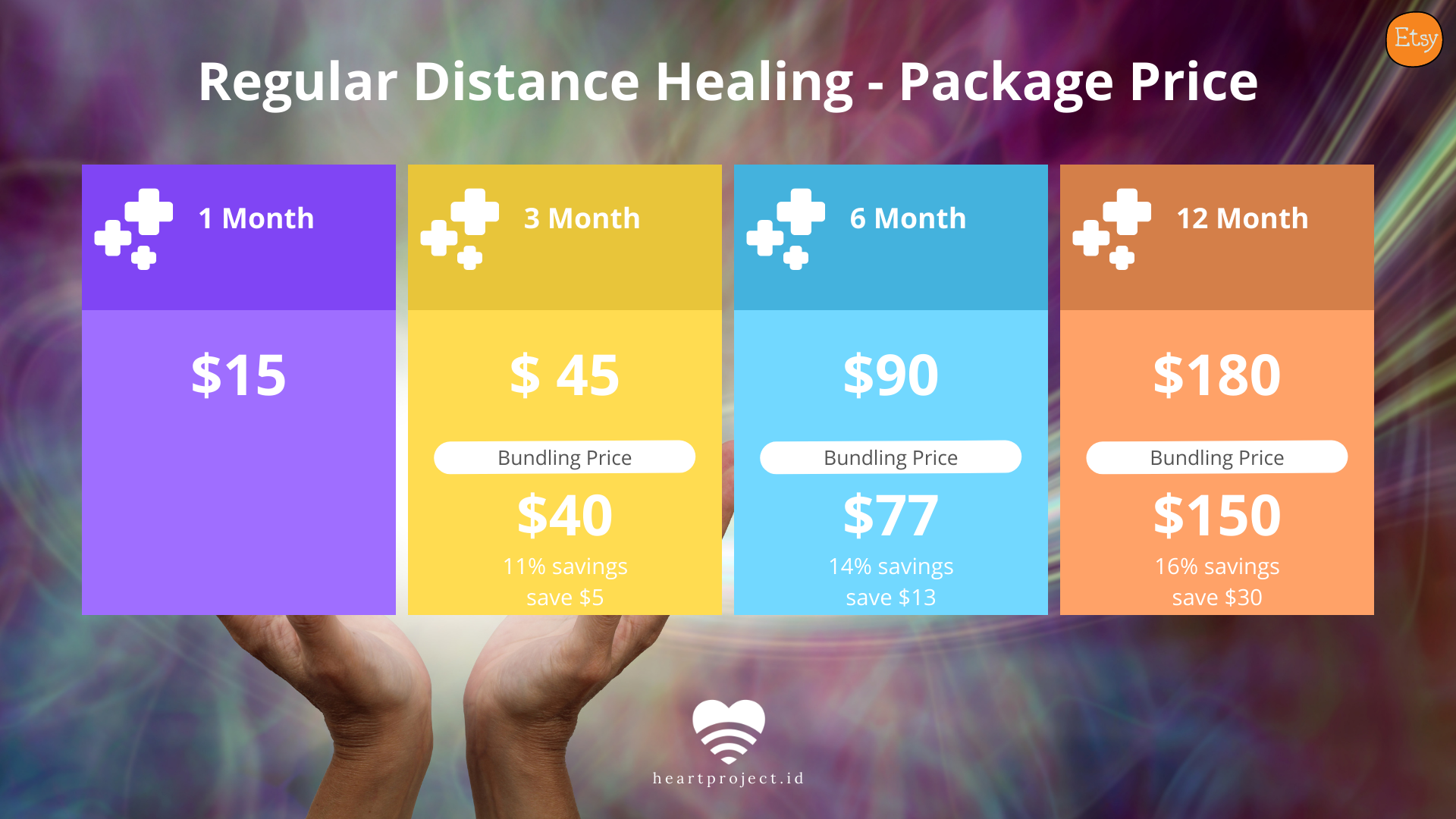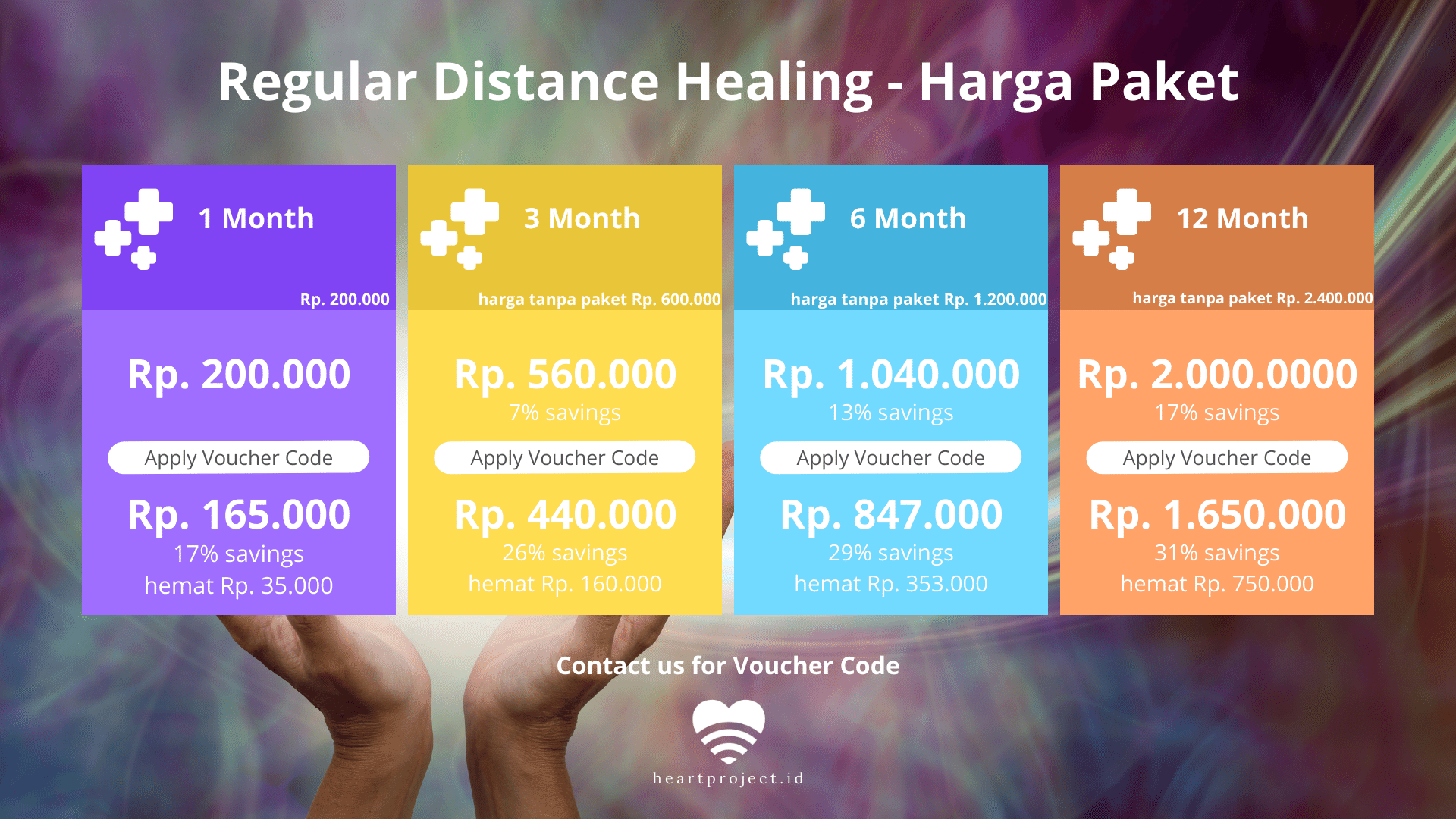 The price for Regular - Natural Distance Healing is USD.15/month if you are from outside of Indonesia or IDR. 200.000/month if you are Indonesian Resident (without voucher code).